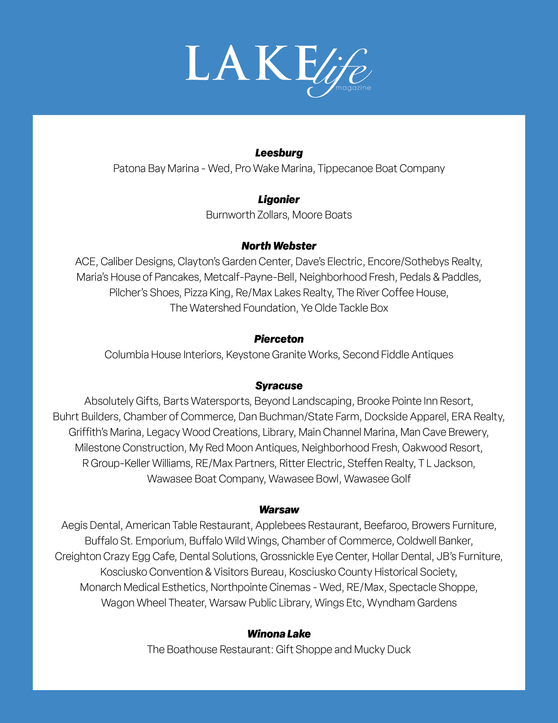 Pick up your copy today! Don't receive a copy at your home?Stop by one of these locations to pick up your copy today!Want LAKElife to come to you? Subscriptions available.